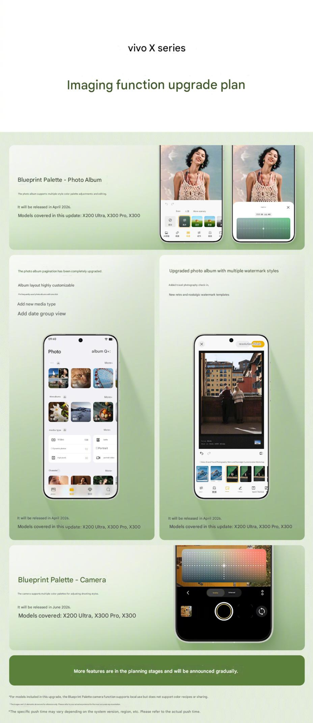 Inoltre, la stessa app conterrà opzioni di filigrana ampliate una volta aggiornata, tra cui nuovi modelli 'nostalgici' e 'retrò'. Attualmente, Vivo offre queste nuove funzioni solo per il modello X300, X300 Pro e all' X200 Ultra. Tuttavia, Vivo prevede di estendere la disponibilità ad altri modelli nel corso dell'anno.