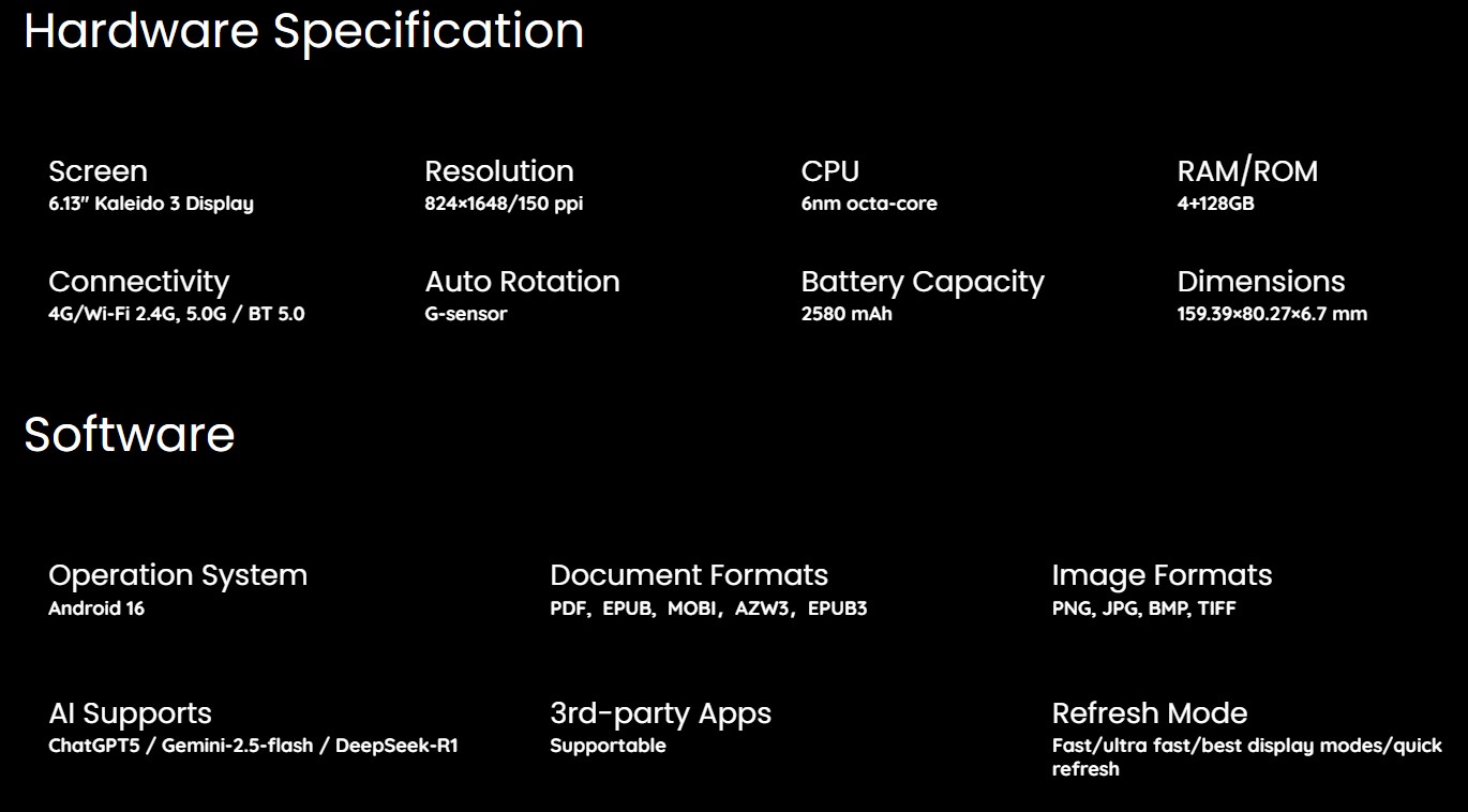 Sotto il cofano, AiPaper Reader C monta una CPU a otto core non specificata, abbinata a 4 GB di RAM e 128 GB di memoria. Dato che gira su Android 16, gli utenti avranno la libertà di ottenere i loro eBook dalla fonte che preferiscono, e ha anche il supporto per formati multipli.