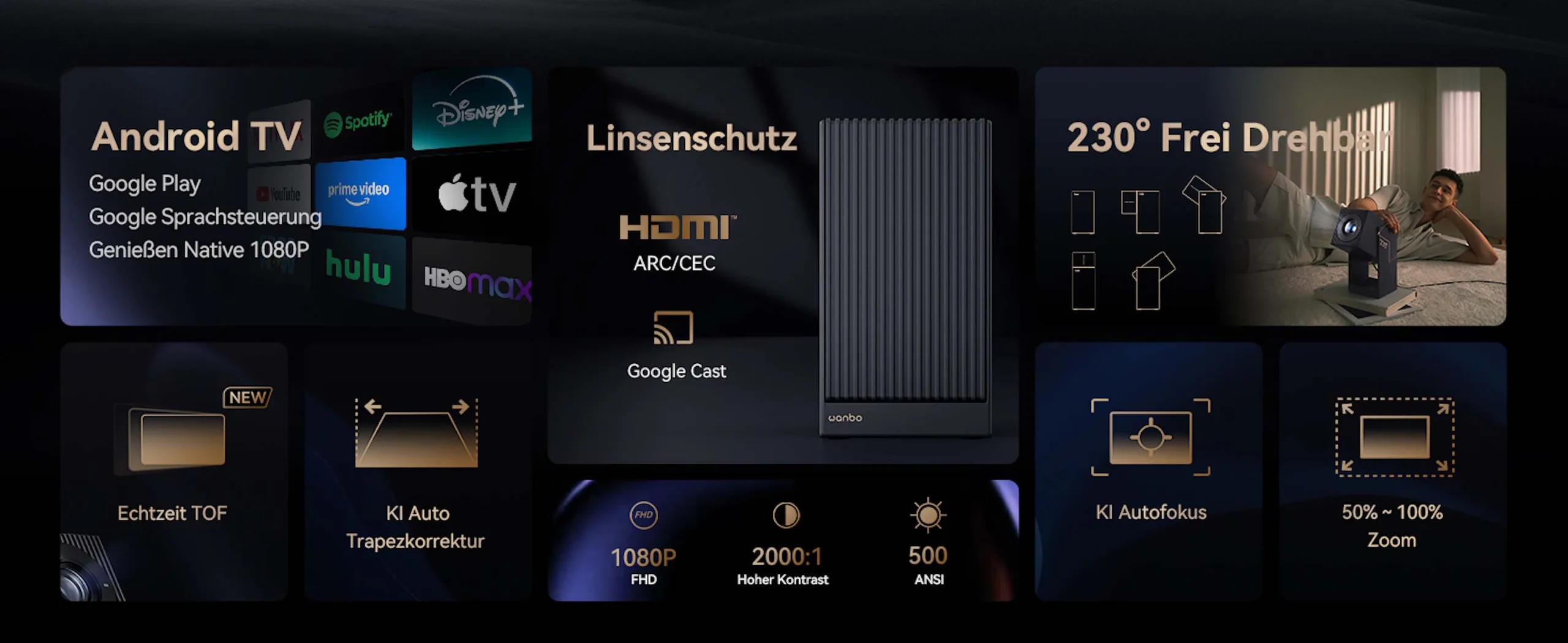Tuttavia, Wanbo Cube 2 Pro ha una luminosità relativamente bassa, il che non sorprende viste le dimensioni e il prezzo. Per essere più precisi, la luminosità ufficiale è di 500 ANSI lumen. La dimensione massima di proiezione è di 120 pollici e il rapporto di proiezione è indicato come 1,2:1. Il proiettore può mettere a fuoco automaticamente grazie a un sensore ToF; anche la correzione trapezoidale è automatica.