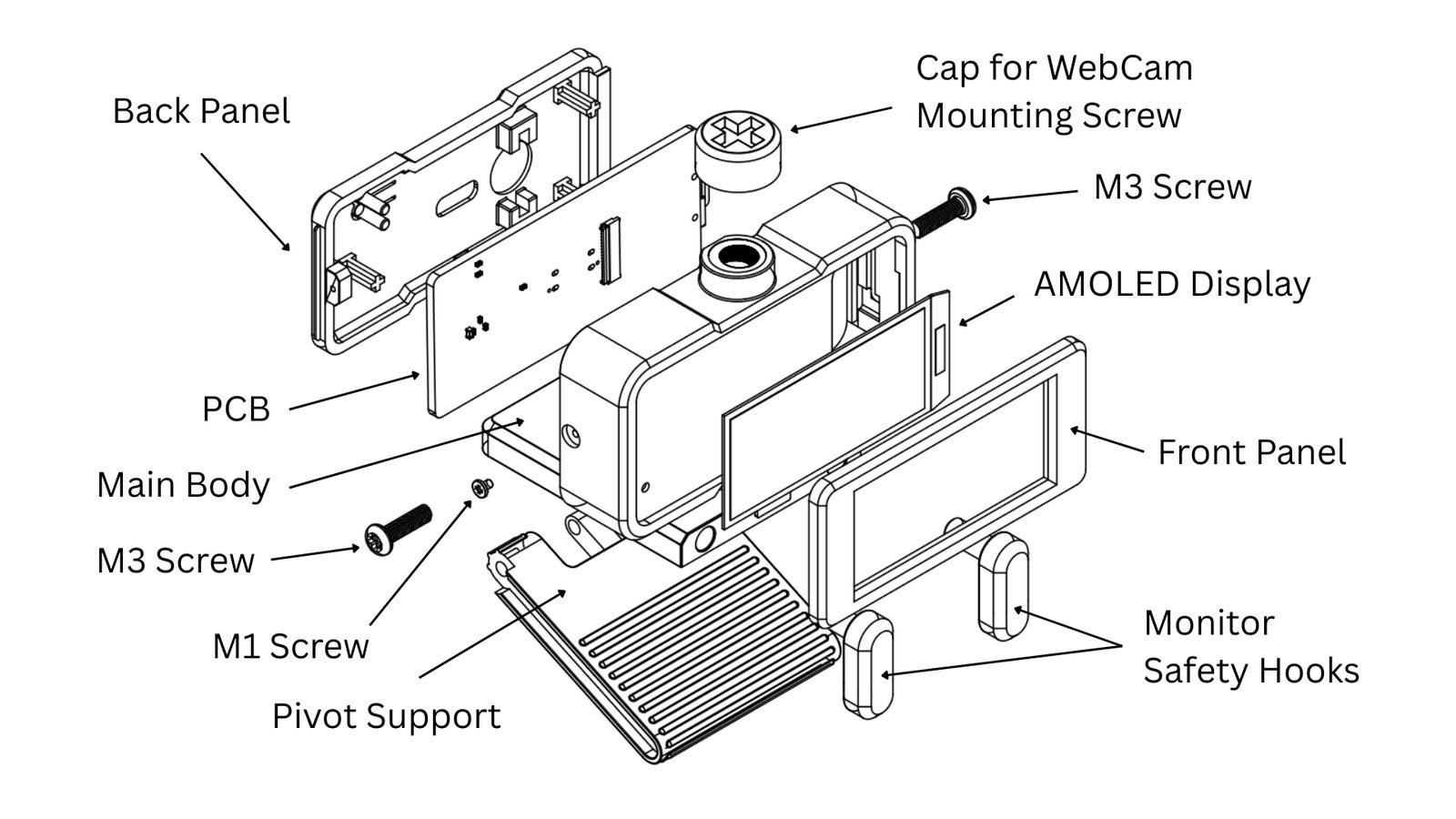 Il dispositivo misura 68 x 60 x 54 mm e pesa circa 100 grammi. È alimentato e collegato tramite USB-C, con un design di montaggio sul monitor che consente di impilare le webcam. Tutti i componenti hardware e software sono open source e rilasciati con licenze permissive per facilitare i contributi della comunità. Un IDE seriale dedicato consente la codifica e il debug di JavaScript in tempo reale senza rimuovere la scheda microSD.