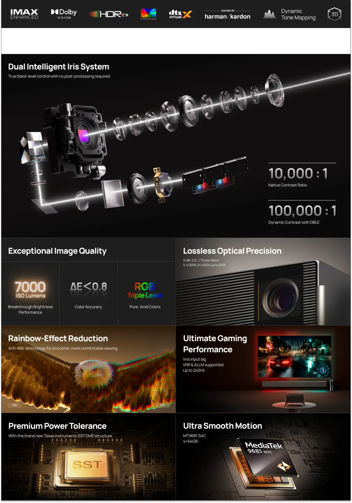 L'ammiraglia Titan Noir Max è dotata di RGB triplo laser e un sistema a doppia iride. Si dice che il proiettore sia costruito per home theater dedicati e spazi abitativi di fascia alta. Inoltre, il proiettore può raggiungere un rapporto di contrasto dell'immagine di 100000:1, grazie alla sua uscita di 7.000 lumen ISO.