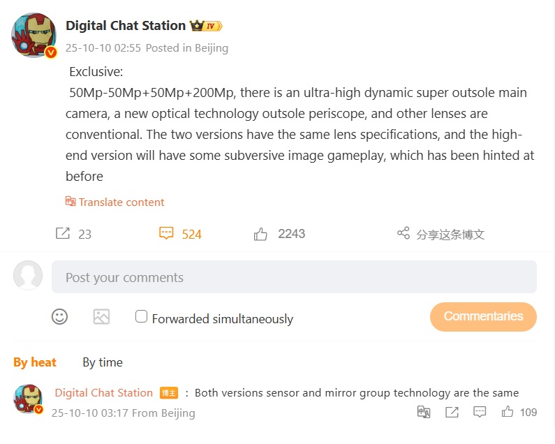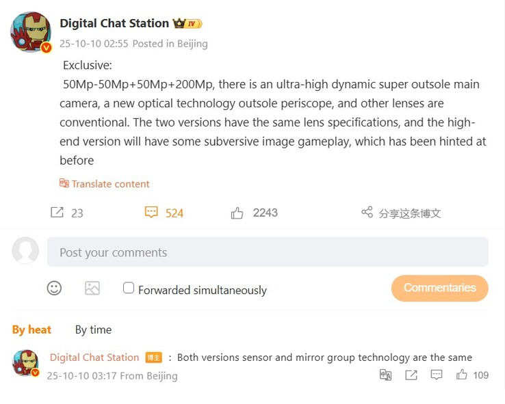 Ci sono anche altre speculazioni su Weibo, che sono state riassunte dall'utente X @Devinarde (vedere sotto). Oltre a uno zoom ottico di circa 3-7x, alcuni utenti di Weibo ipotizzano anche un team di sensori composto dall'ISOCELL HPE da 200 MP da 1/1. 4 pollici e dall'ISOCELL JN5 da 1/1.276 pollici, che a quanto pare formano una sorta di configurazione a doppio teleobiettivo con un'ottica che potrebbe funzionare in modo simile a quella dell'Huawei Pura 80 Ultra Huawei Pura 80 Ultra con il suo cursore mobile, solo al contrario.