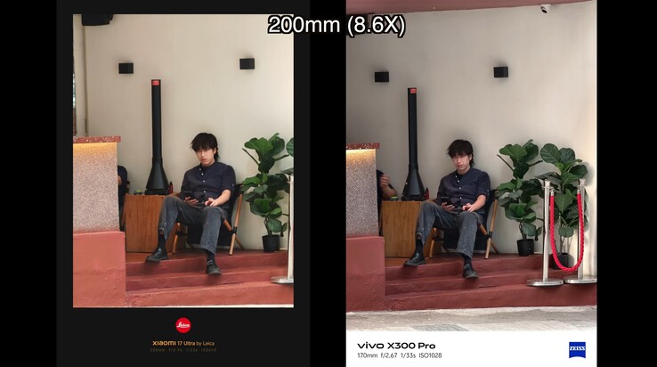 Preferiamo la prima foto di Vivo perché è notevolmente più nitida, anche se lo sfondo giallastro del muro è catturato meglio dallo Xiaomi 17 Ultra. Nel secondo scatto, nessuna delle due immagini è ideale. Sull'X300 Pro, il viso sembra eccessivamente elaborato dall'AI, mentre lo Xiaomi 17 Ultra lo fa sembrare morbido. Il recensore passa poi a condividere le sue prime riprese video da Hong Kong. Xiaomi sembra aver fatto un buon lavoro con la transizione dallo zoom ottico allo zoom digitale a partire da 100 mm.