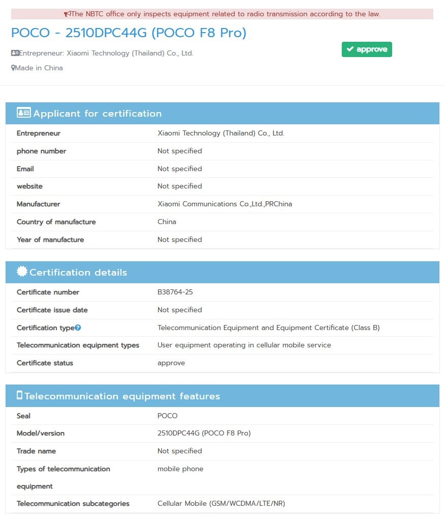 Per ora, l'azienda non ha rivelato ufficialmente alcun dettaglio. Tuttavia, l'esistenza del Poco F8 Pro è stata confermata da una certificazione NBTC (National Broadcasting and Telecommunications Commission) in Tailandia. La certificazione non rivela alcuna specifica chiave del dispositivo. Tuttavia, conferma che il numero di modello "2510DPC44G" appartiene al modello globale Poco F8 Pro.