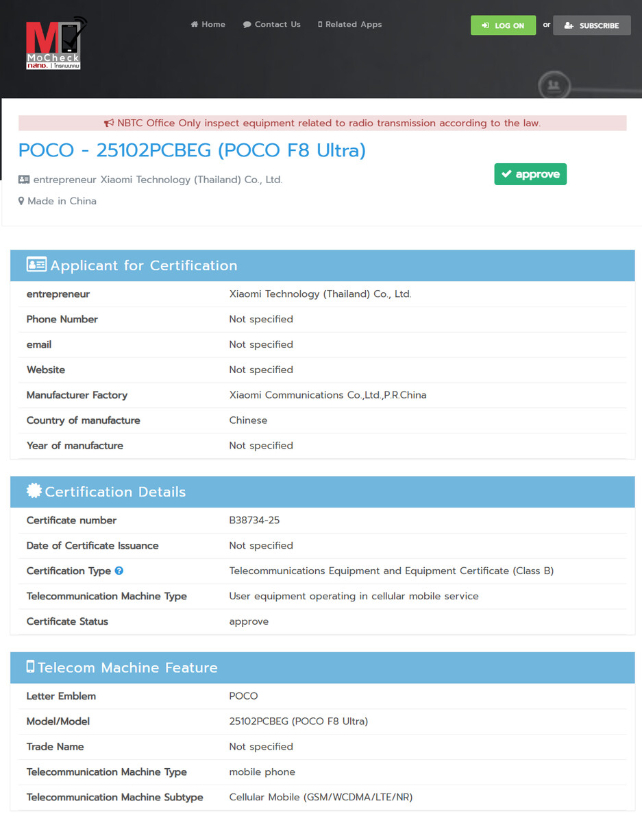 Ora, questo secondo numero di modello è emerso sul sito della National Broadcasting and Telecommunications Commission (NBTC) in Tailandia. Mostrato qui sotto, l'elenco NBTC conferma essenzialmente che Xiaomi sta lavorando per offrire il 25102PCBEG a livello globale. Non solo, ma è la prima volta che il 25102PCBEG è stato esplicitamente collegato al vero nome 'Poco F8 Ultra'.