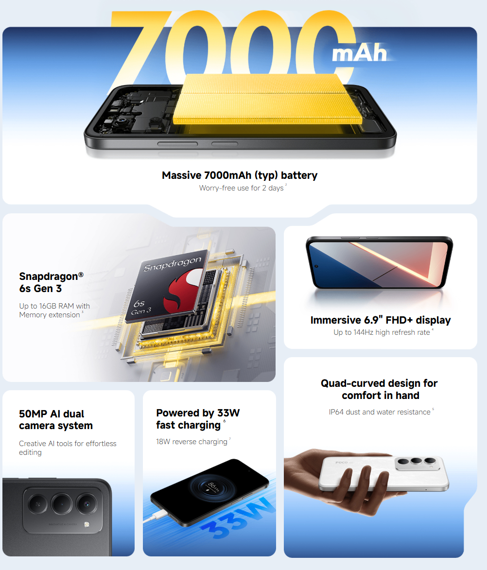 In breve, il Poco M8s è un re-branding del Redmi 15 (al momento 199 dollari su Amazon). Di conseguenza, il nuovo smartphone presenta anche uno Snapdragon 6s Gen 3 chipset, una batteria da 7.000 mAh e una fotocamera primaria da 50 MP. Il Poco M8s vanta anche una frequenza di aggiornamento di 144 Hz sul suo display da 1080p, oltre al supporto della ricarica cablata da 33 W per la sua grande batteria.