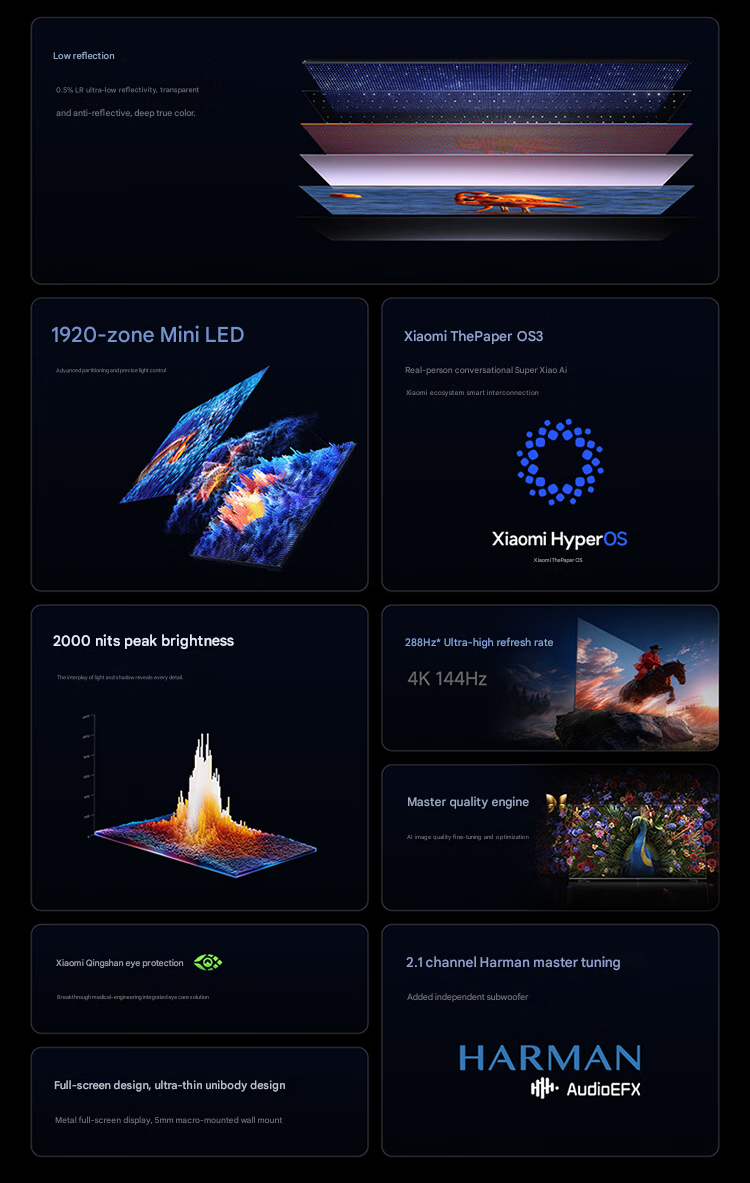 L'ultima ultima linea EUinvece, raggiunge i 98 pollici, ha una luminosità di picco di 1.200 nit e presenta fino a 880 zone di oscuramento. Oltre a queste, Xiaomi sottolinea le proprietà di bassa riflessione della serie cinese S Mini LED TV 2026. C'è un "film a basso riflesso dello 0,5%", che dovrebbe garantire un'esperienza visiva migliore in condizioni di illuminazione difficili.
