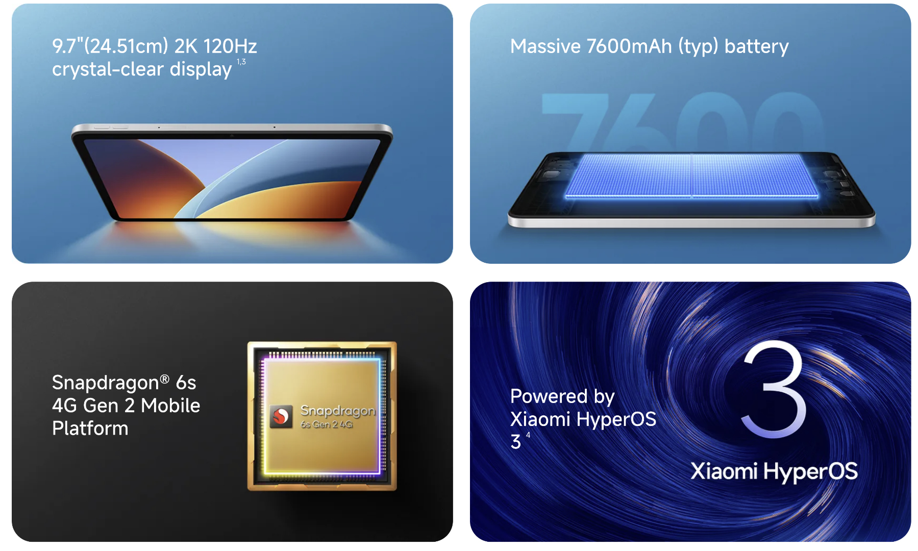 Per quanto ne sappiamo, il Redmi Pad 2 9.7 riprende tutto l'hardware dell'attuale Redmi Pad 2 SE. Per esempio, Xiaomi menziona un chipset Snapdragon 6s 4G Gen 2, oltre a una batteria da 7.600 mAh che supporta la ricarica cablata a 18 W. Il nuovo tablet dispone anche di un display IPS a 120 Hz che risolve a 2.048 x 1.280 con un rapporto di aspetto 16:10 e con una luminosità di picco fino a 600 nits in modalità esterna.