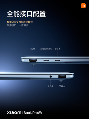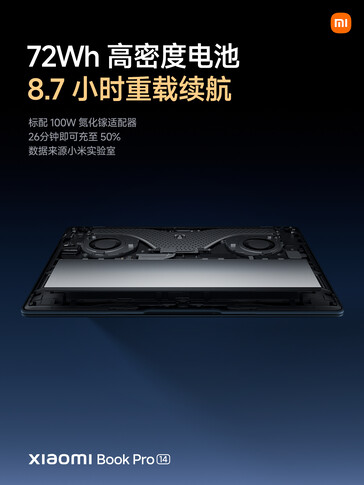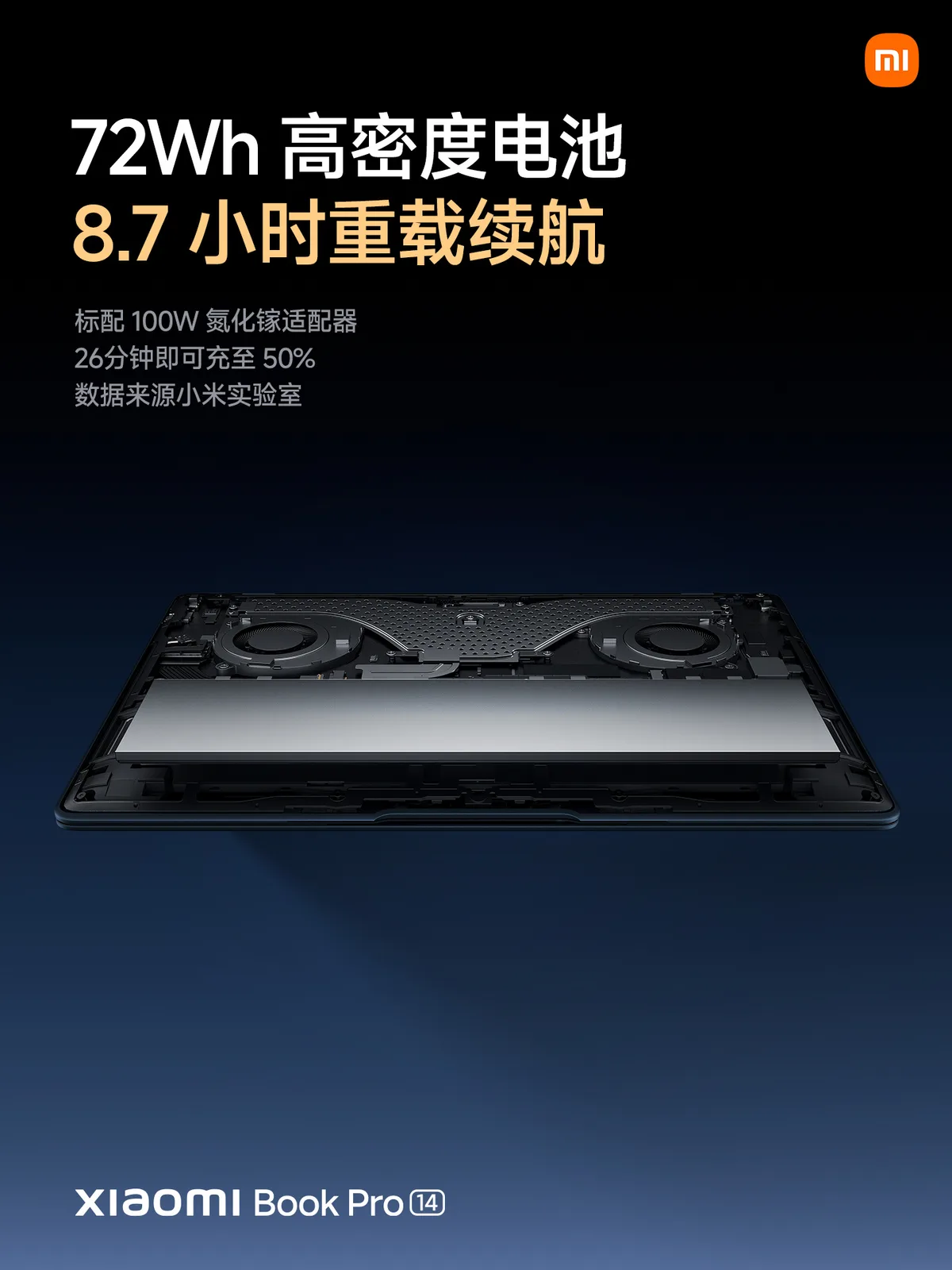 Inoltre, Xiaomi installa una batteria da 72 Wh con supporto per la ricarica da 100 W per alimentare il display OLED da 500 nit, 120 Hz e 3.120 x 2.080 pixel del portatile. Xiaomi completa questo display 3:2 con un touchpad da 140 x 93 mm e tasti retroilluminati che offrono una corsa dei tasti di 1,3 mm. Il Book Pro 14 contiene anche porte HDMI e USB Type-A di dimensioni standard, nonostante il suo ingombro ridotto.