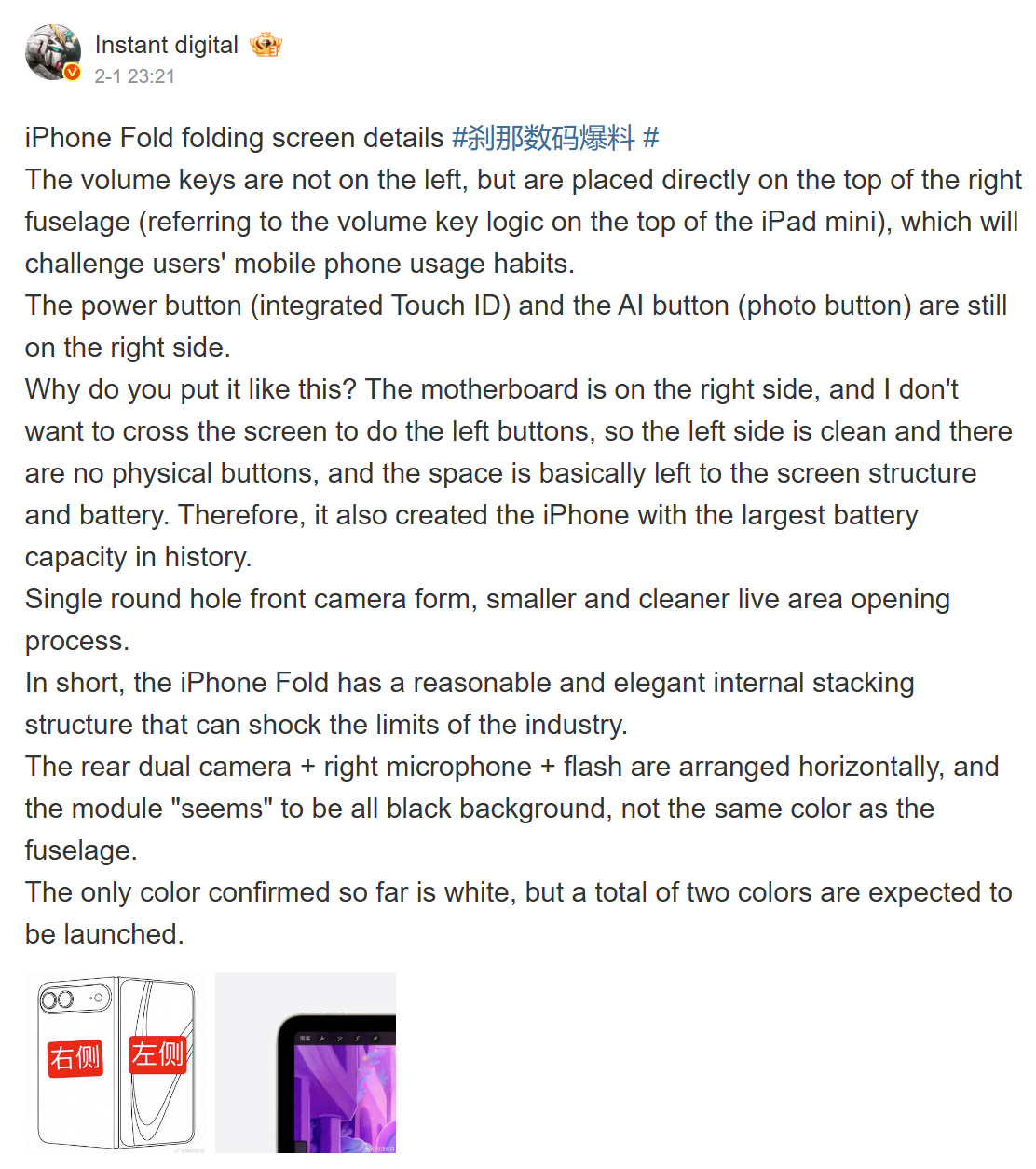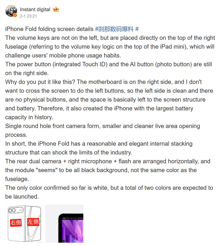 In altre parole, Fixed Focus Digital suggerisce che il pieghevole di Apple sarà lanciato con vantaggi di batteria del 25% e del 10% rispetto a Z Fold7 Galaxy Z Fold7 e Pixel 10 Pro Foldrispettivamente (attualmente 1.499 dollari su Amazon). In un post più recente, Instant Digital ribadisce l'affermazione di Fixed Focus Digital, aggiungendo che l'assenza di pulsanti fisici sul lato sinistro del pieghevole ha permesso a Apple di massimizzare la capacità della batteria.