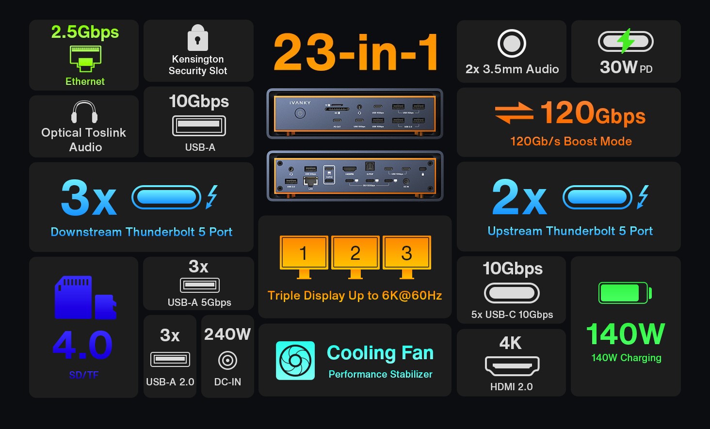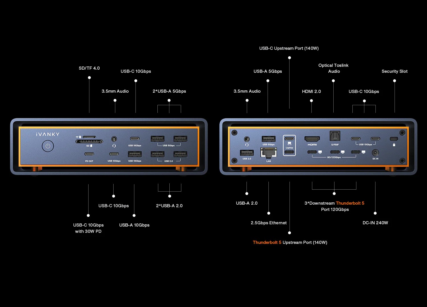 A differenza della maggior parte dei dock Thunderbolt 5, FusionDock Max 2 si collega all'host utilizzando due porte Thunderbolt 5. In cambio offre 23 porte di connettività, tra cui tre porte Thunderbolt 5 a valle per monitor esterni, SSD e altri dispositivi ad alta velocità. In cambio, offre 23 porte di connettività, tra cui tre porte Thunderbolt 5 downstream per monitor esterni, SSD e altri dispositivi ad alta velocità. Dispone inoltre di una porta HDMI 2.0, cinque porte USB-C da 10 Gbps, una porta USB-A da 10 Gbps, tre porte USB-A da 5 Gbps, tre porte USB 2.0, doppio jack audio da 3,5 mm, audio ottico, una porta LAN da 2,5 Gbps e slot SD/TF 4.0.