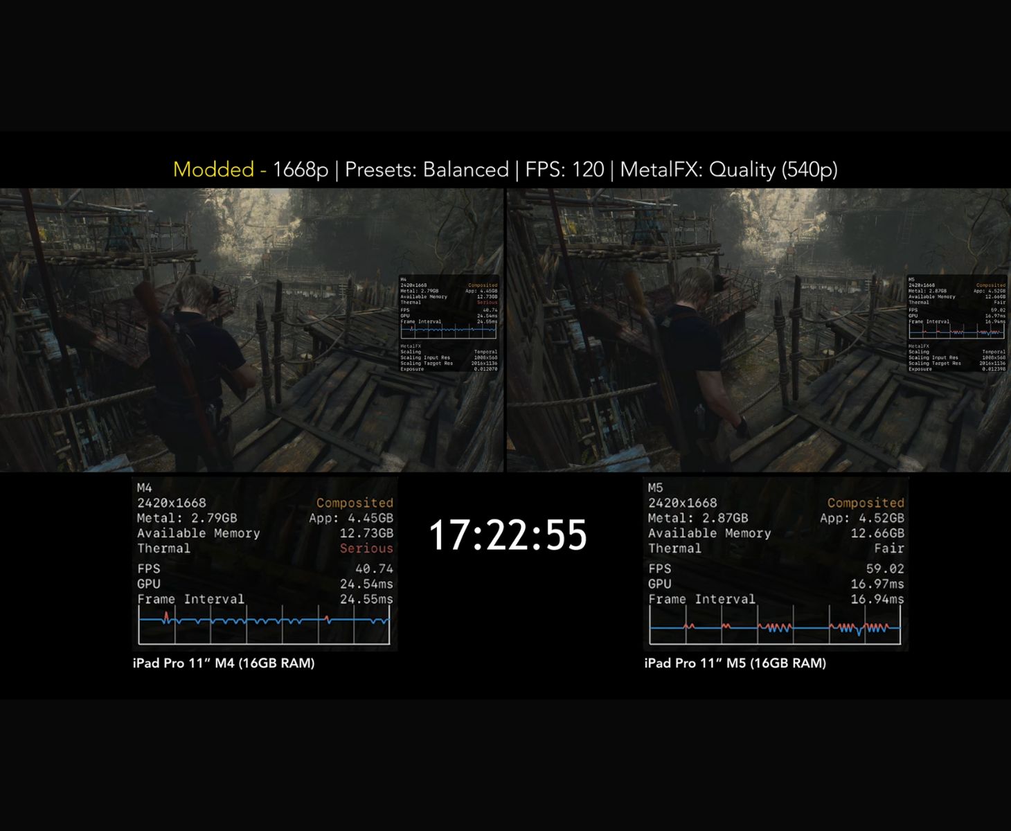 Il gioco ha funzionato a circa 60 FPS quando lo YouTuber ha modificato i file di configurazione, impostando la preimpostazione su Bilanciato, abbassando la risoluzione, attivando la modalità MetalFX Quality e impostando l'obiettivo FPS a 120. Con queste impostazioni più elevate, l'iPad Pro M5 è riuscito a raggiungere 50-60 FPS. Nel frattempo, l'iPad Pro M4 è sceso a metà degli anni 40 e l'M1 ha faticato a mantenere anche 20 FPS.