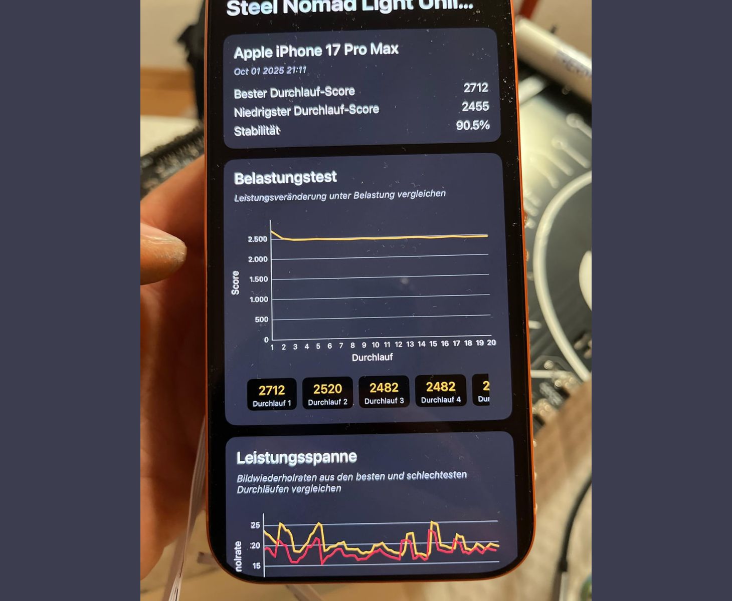 Ed è effettivamente vero, in quanto la scheda logica contenente la CPU A19 Pro, la GPU e il Neural Engine è posizionata leggermente più in alto nella batteria, sotto il nuovo Camera Plateau. Tuttavia, l'esperimento è chiaramente un successo in termini di stabilità termica durante gli stress test. Se è interessato, il thread originale su Reddit è collegato qui sotto.