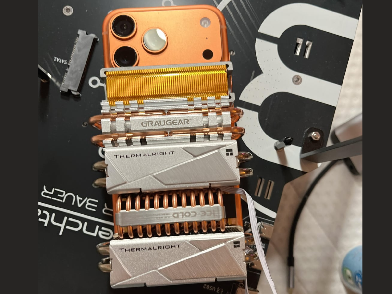 Le foto sul post di Reddit intitolato "17 Pro Max Cooling with M2 SSD Cooler 90% Stability in 3D Mark Stress Test" mostrano una configurazione di raffreddamento fai-da-te in cui i dissipatori di calore di livello desktop e i dissipatori a tubi di calore, normalmente utilizzati per gli SSD, sono montati sull'iPhone 17 Pro Max per ridurre il throttling termico durante i giochi pesanti o i benchmark.