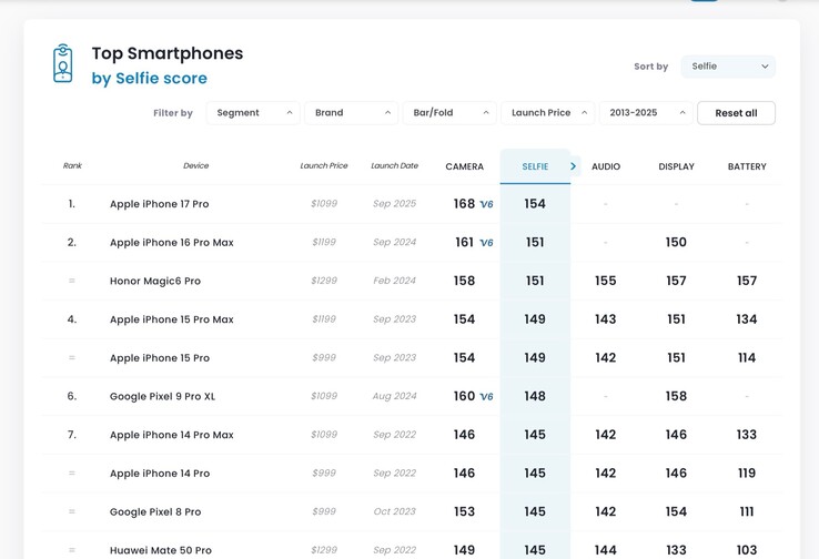 In un'analisi dettagliata di DxOMark, l'aggiornamento è stato chiaramente ripagato, in quanto l'iPhone 17 Pro ha ottenuto 154 punti nella recensione della fotocamera selfie e ha conquistato la prima posizione nella classifica. Apple la nuova ammiraglia di DxOMark precede l'iPhone 16 Pro e Honor Magic6 Pro, che hanno entrambi ottenuto 151 punti e si trovano ora al secondo posto, seguiti dall'iPhone 15 Pro con 149 punti e dal Google Pixel 9 Pro XL con 148 punti.