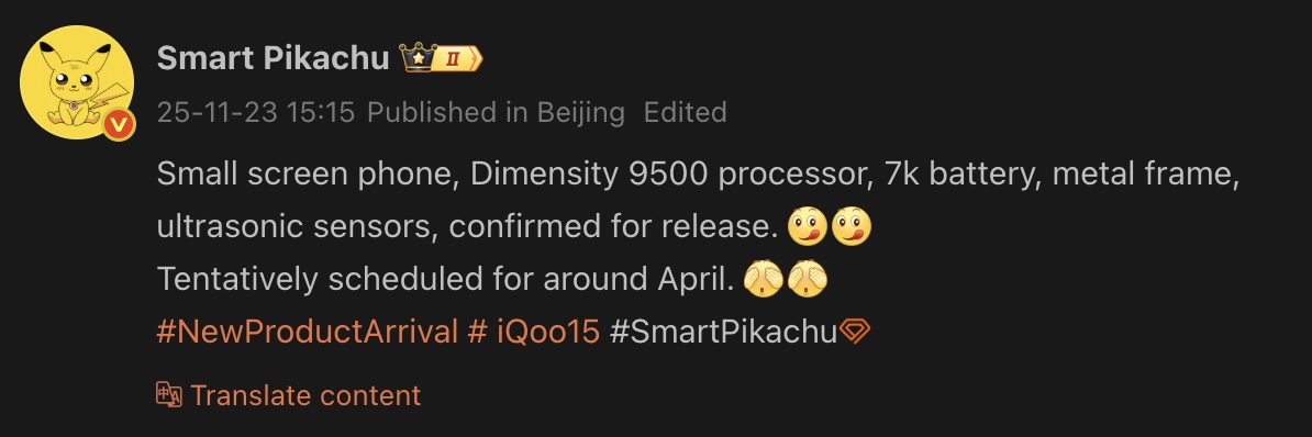 L'informatore suggerisce che l'iQoo 15 Mini sarà lanciato intorno ad aprile 2026. Il prossimo anno è previsto l'arrivo di altri smartphone compatti, tra cui il modello OnePlus 15T e Oppo Find X9s. Inoltre, Honor dovrebbe rilasciare il modello Magic 8 Mini.